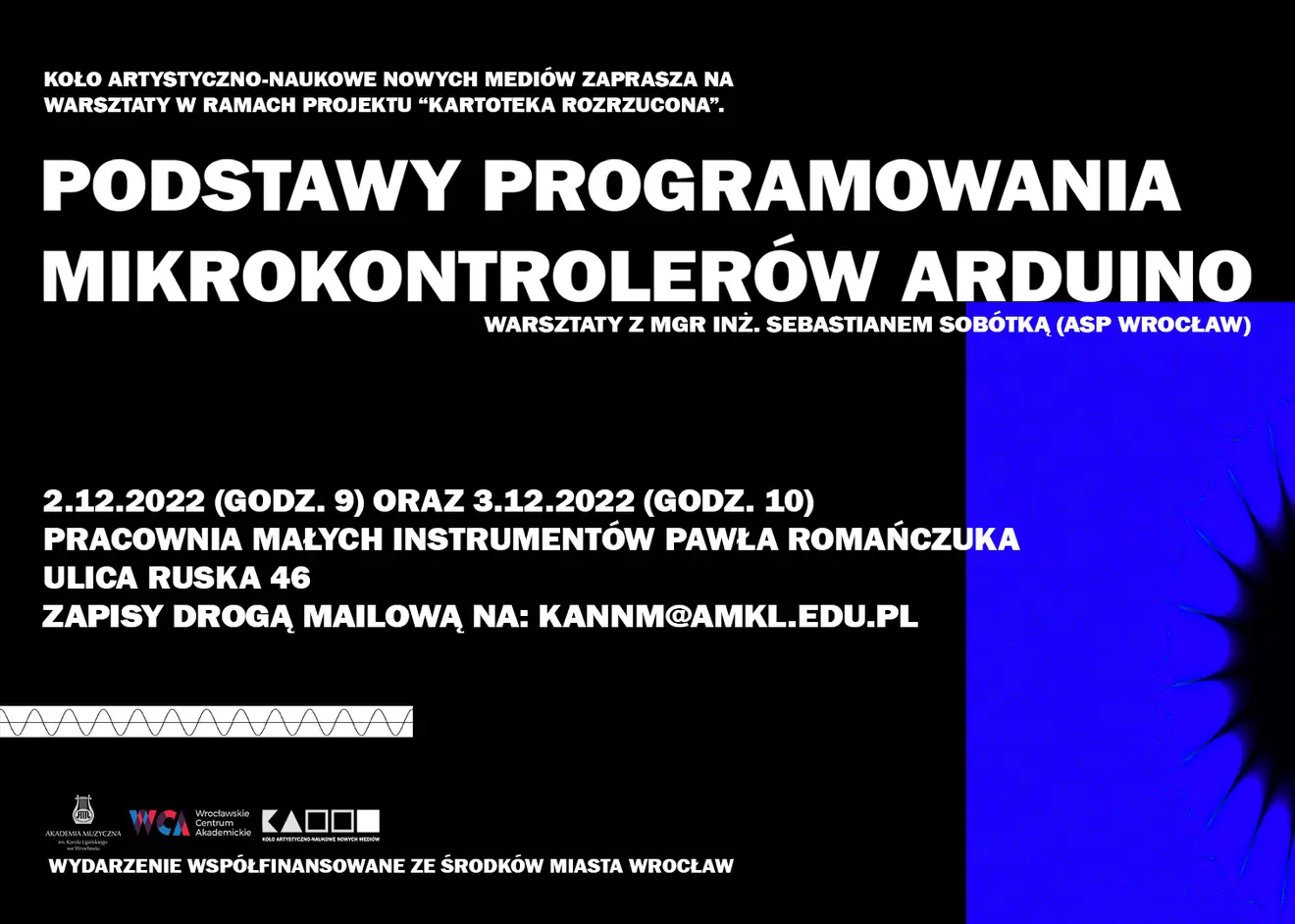 02.12.2022Koło Artystyczno-Naukowe Nowych Mediów Akademii Muzycznej we Wrocławiu serdecznie zaprasza na warsztaty z programowania elektronicznych mikrokontrolerów Arduino, które odbędzie się w piątek (2 grudnia) w godzinach 9-13.30 oraz w sobotę (3 grudnia) w godzinach 10-14. Warsztaty odbywają się w Pracowni Małych Instrumentów Pawła Romańczuka przy ulicy Ruskiej 46.