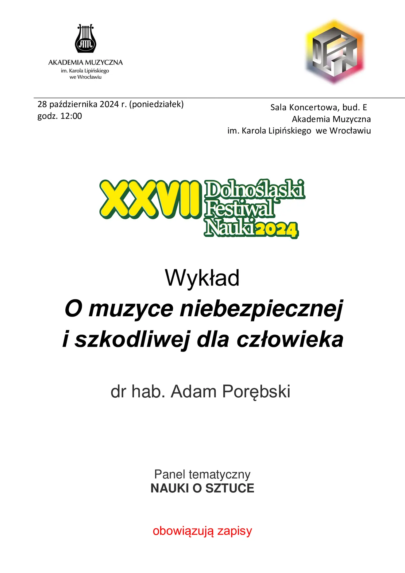 W ramach Dolnośląskiego Festiwalu Nauki 2024 odbywa się wykład pt. „O muzyce niebezpiecznej i szkodliwej dla człowieka”, który prowadzi dr hab. Adam Porębski.