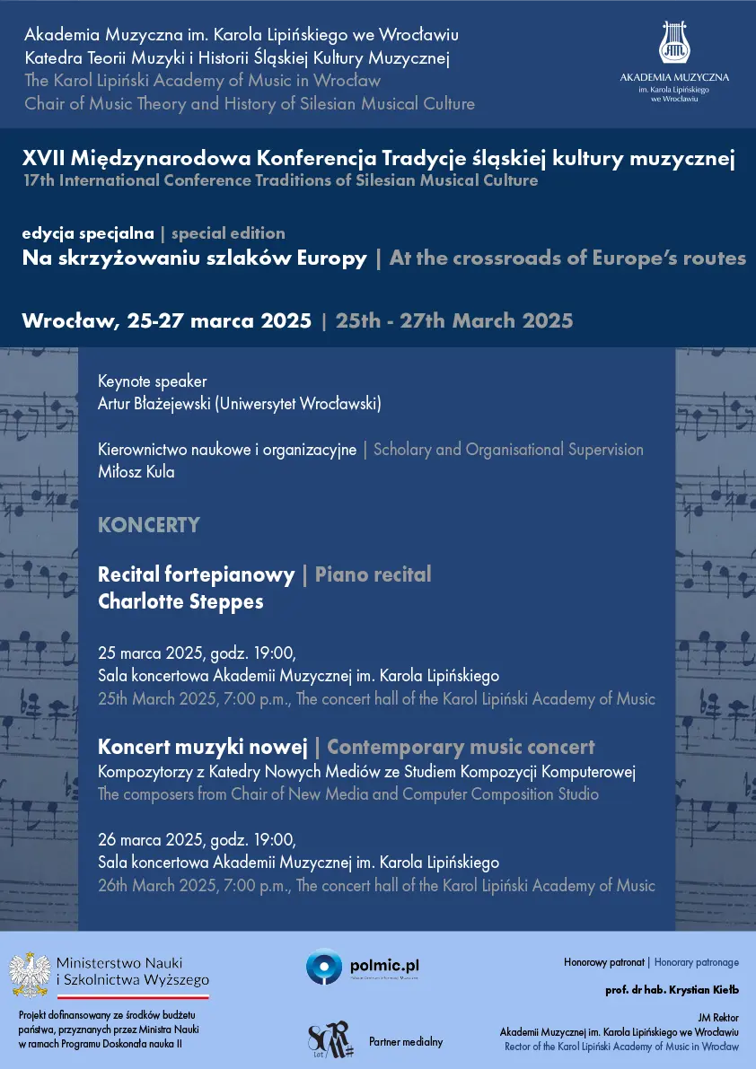 We invite you to a unique academic event dedicated to the richness and diversity of Silesian musical culture, which will take place on March 25–27, 2025, at the Karol Lipiński Academy of Music in Wrocław. This year's 17th edition of the conference coincides with the period of Poland's presidency of the European Union, giving the event a special international dimension.