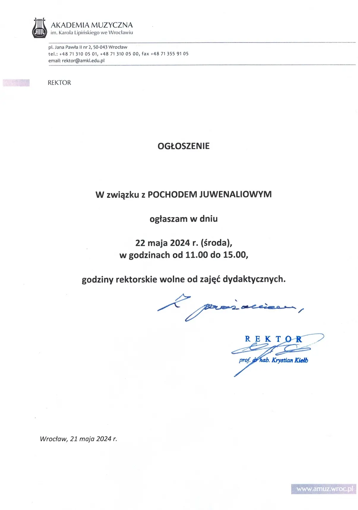 W związku z Pochodem Juwenaliowym w dniu 22 maja 2024 r. w obowiązują godziny rektorskie wolne od zajęć dydaktycznych.