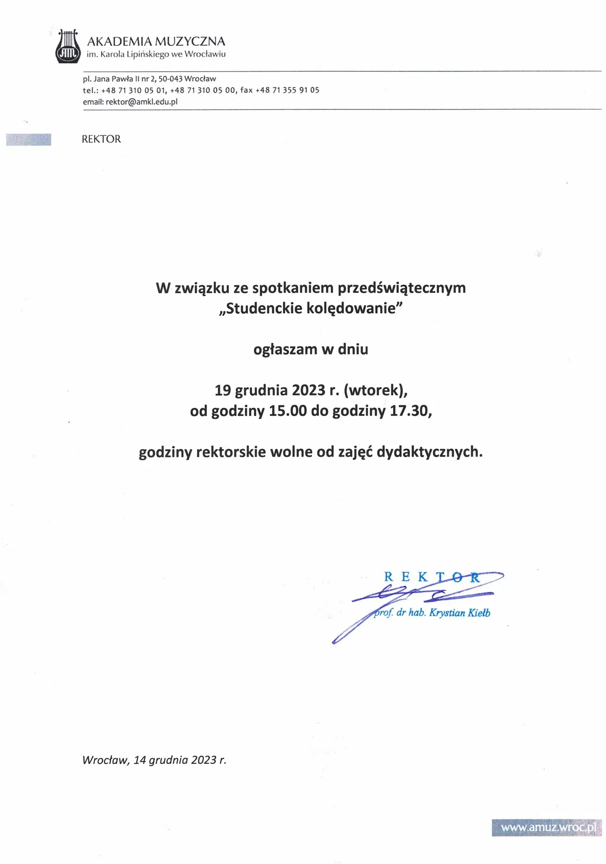 Godziny rektorskie w dniu 19.12.2023 r.