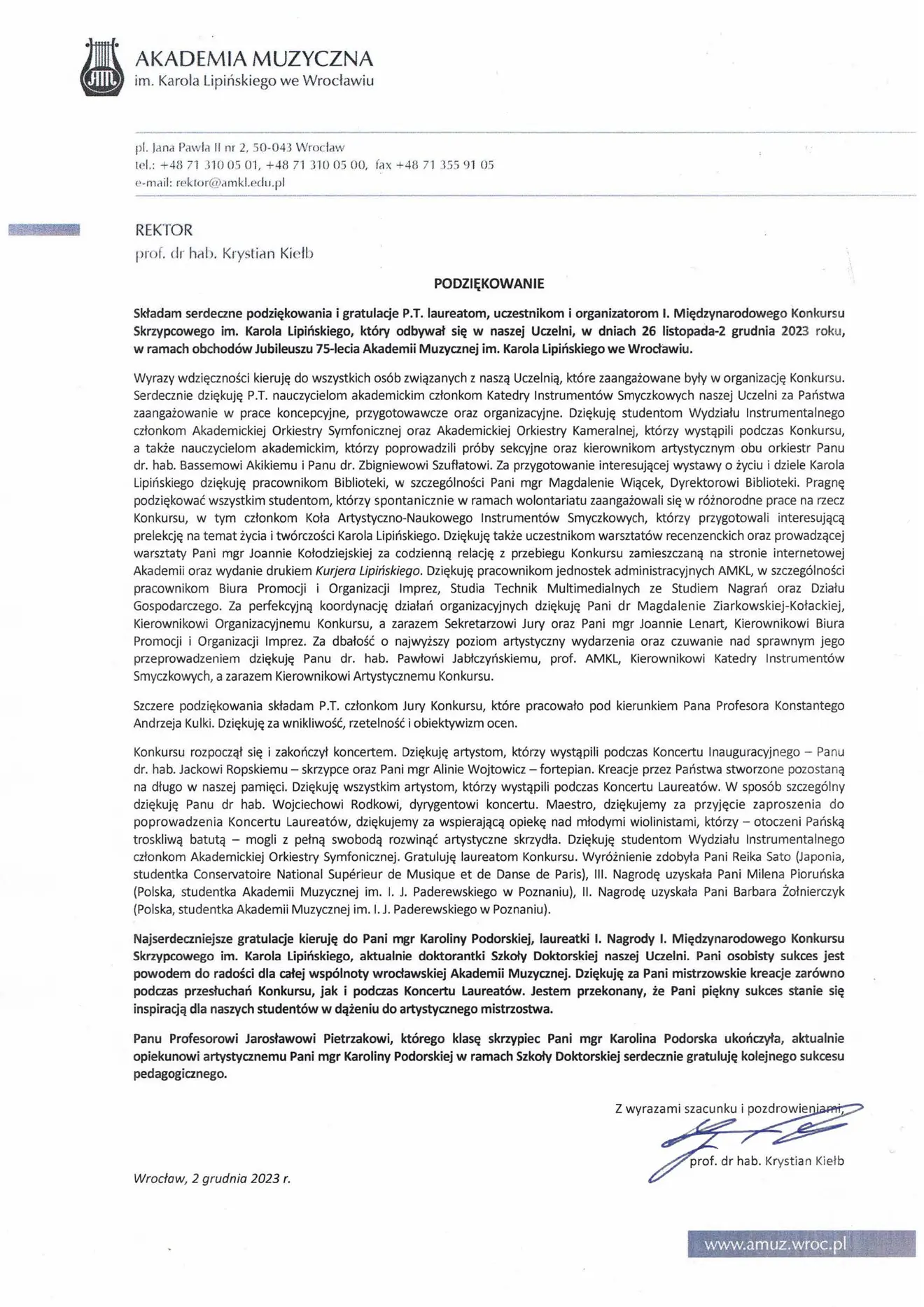 W dniach 26 listopada – 2 grudnia 2023 roku Akademia Muzyczna im. Karola Lipińskiego we Wrocławiu była organizatorem pierwszej edycji Międzynarodowego Konkursu Skrzypcowego im. Karola Lipińskiego. Konkurs zgromadził 19 młodych skrzypków z całego świata, którzy po przejściu etapu preeliminacji zostali zaproszeni do bezpośredniej rywalizacji i zaprezentowali swoje umiejętności podczas trzech etapów turnieju.