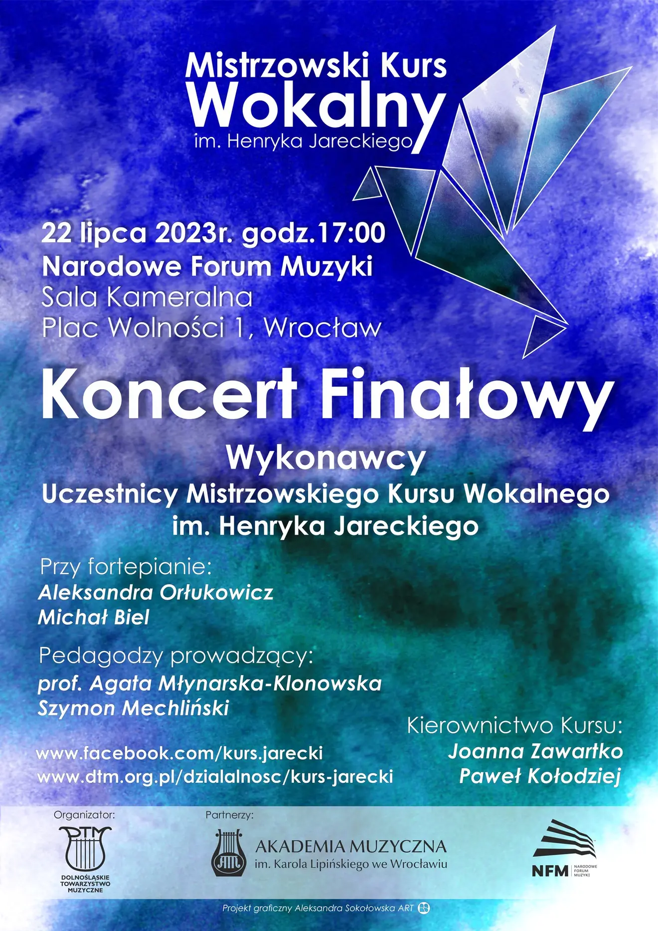 W dniach 17-22 lipca 2023 r. w Akademii Muzycznej im. Karola Lipińskiego we Wrocławiu odbywa się III Mistrzowski Kurs Wokalny im. Henryka Jareckiego, organizowany we współpracy ze Stowarzyszeniem Dolnośląskie Towarzystwo Muzyczne. Do prowadzenia kursu zaproszeni zostali wybitni artyści: prof. dr hab. Agata Młynarska-Klonowska z Wydziału Wokalnego AMKL oraz baryton Szymon Mechliński, a także pianiści: absolwentka AMKL mgr Aleksandra Orłukowicz i mgr Michał Biel. Kierownictwo artystyczne Kursu obejmują pedagodzy Wydziału Wokalnego: mgr Joanna Zawartko i mgr Paweł Kołodziej. Już teraz serdecznie zapraszamy Państwa na finał Kursu, który zostanie zwieńczony koncertem w Narodowym Forum Muzyki 22 lipca o godzinie 17:00.