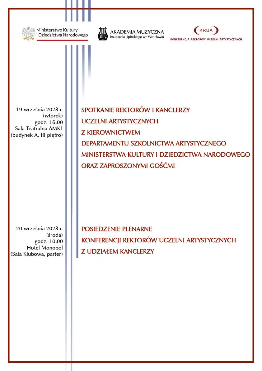 Dnia 19 września w AMKL odbędzie się spotkanie Rektorów i Kanclerzy Uczelni artystycznych z kierownictwem Departamentu Szkolnictwa Artystycznego Ministerstwa Kultury i Dziedzictwa Narodowego oraz zaproszonymi gośćmi.
