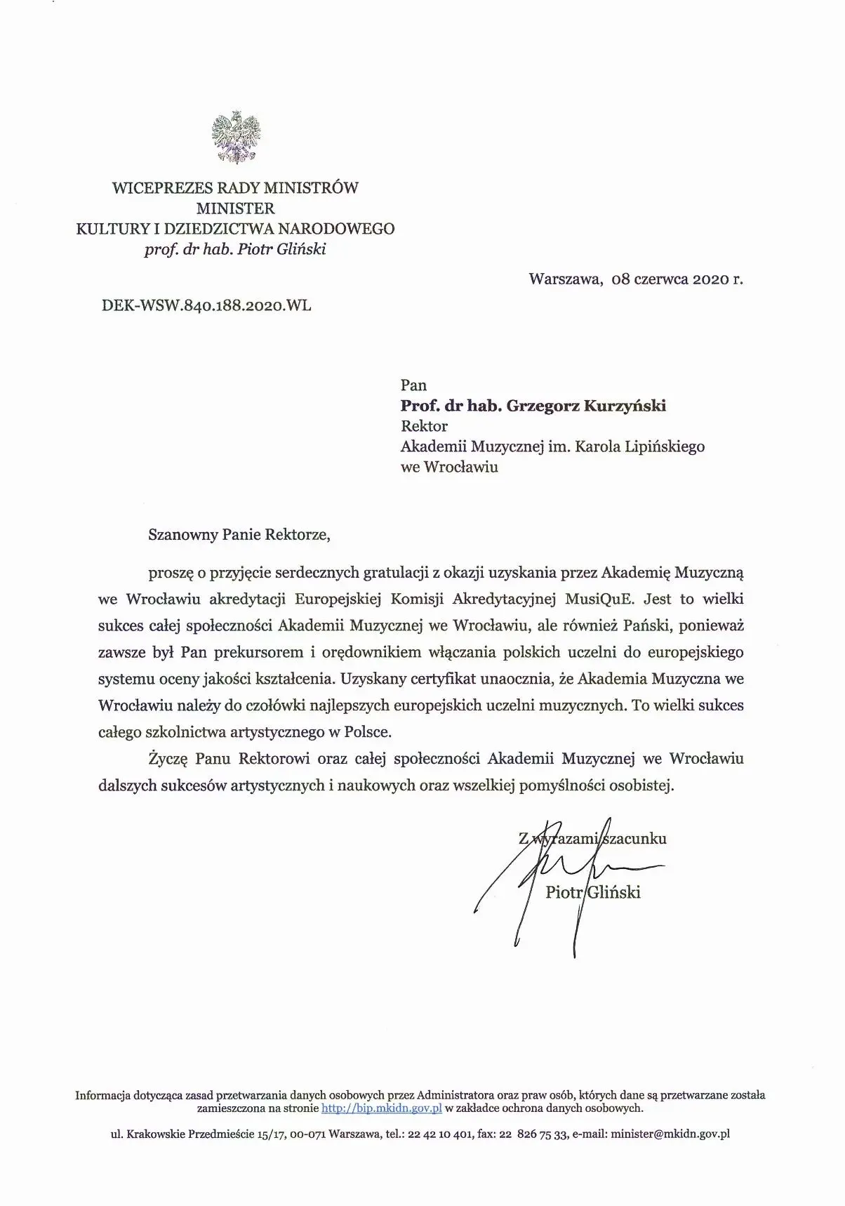 List gratulacyjny od Ministra Kultury i Dziedzictwa Narodowego dla Akademii Muzycznej im. K. Lipińskiego we Wrocławiu