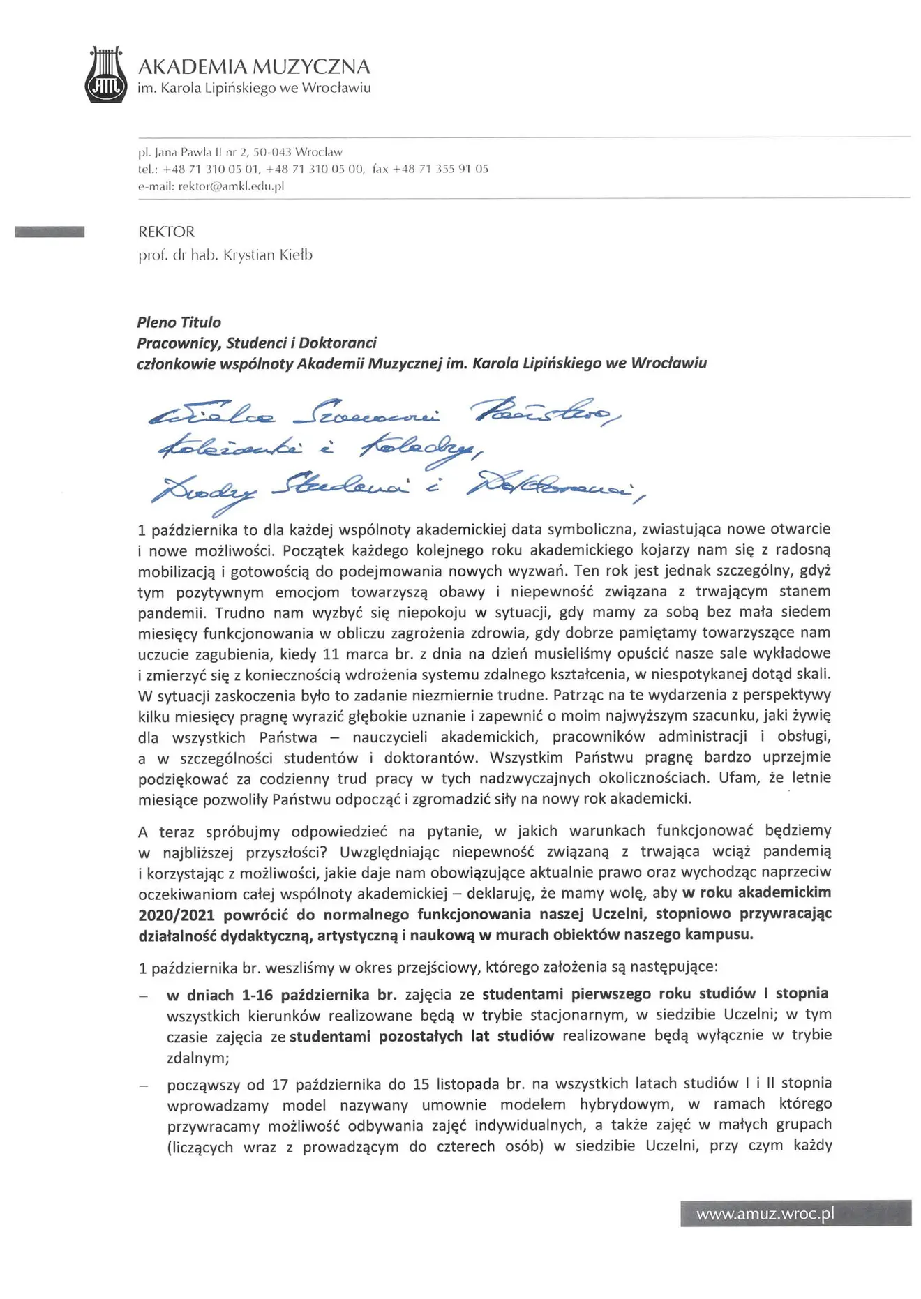 List JM Rektora prof. dra hab. Krystiana Kiełba do wspólnoty akademickiej z okazji rozpoczęcia roku akademickiego 2020/2021