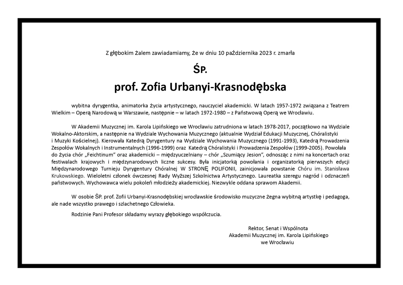 Z głębokim żalem zawiadamiamy, że w dniu 10 października 2023 r. zmarła ŚP. prof. Zofia Urbanyi-Krasnodębska.
