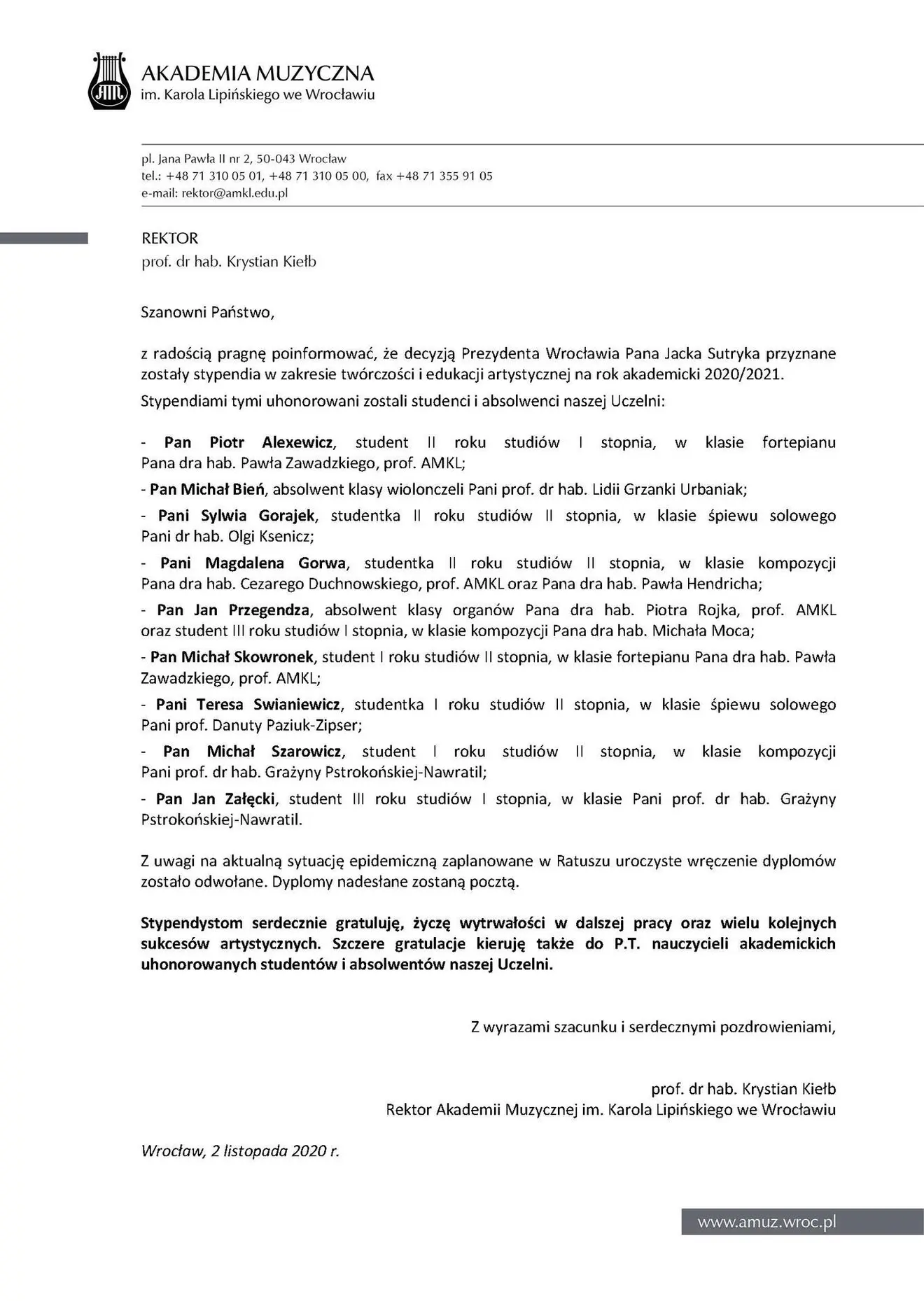 Studenci i absolwenci naszej Uczelni zostali uhonorowani przez Prezydenta Wrocławia Pana Jacka Sutryka stypendiami w zakresie twórczości i edukacji artystycznej na rok akademicki 2020/2021.