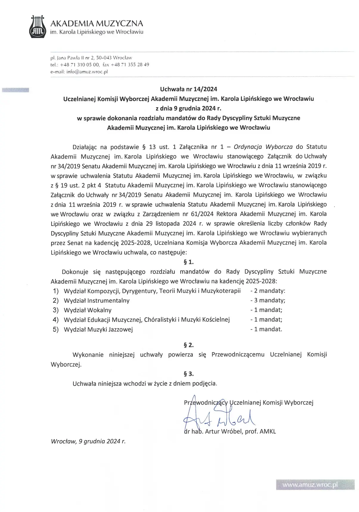 Prezentujemy tekst Uchwały Komisji Wyborczej Akademii Muzycznej im. Karola Lipińskiego we Wrocławiu z dnia 9 grudnia 2024 w sprawie dokonania rozdziału mandatów do Rady Dyscypliny Sztuki Muzyczne.