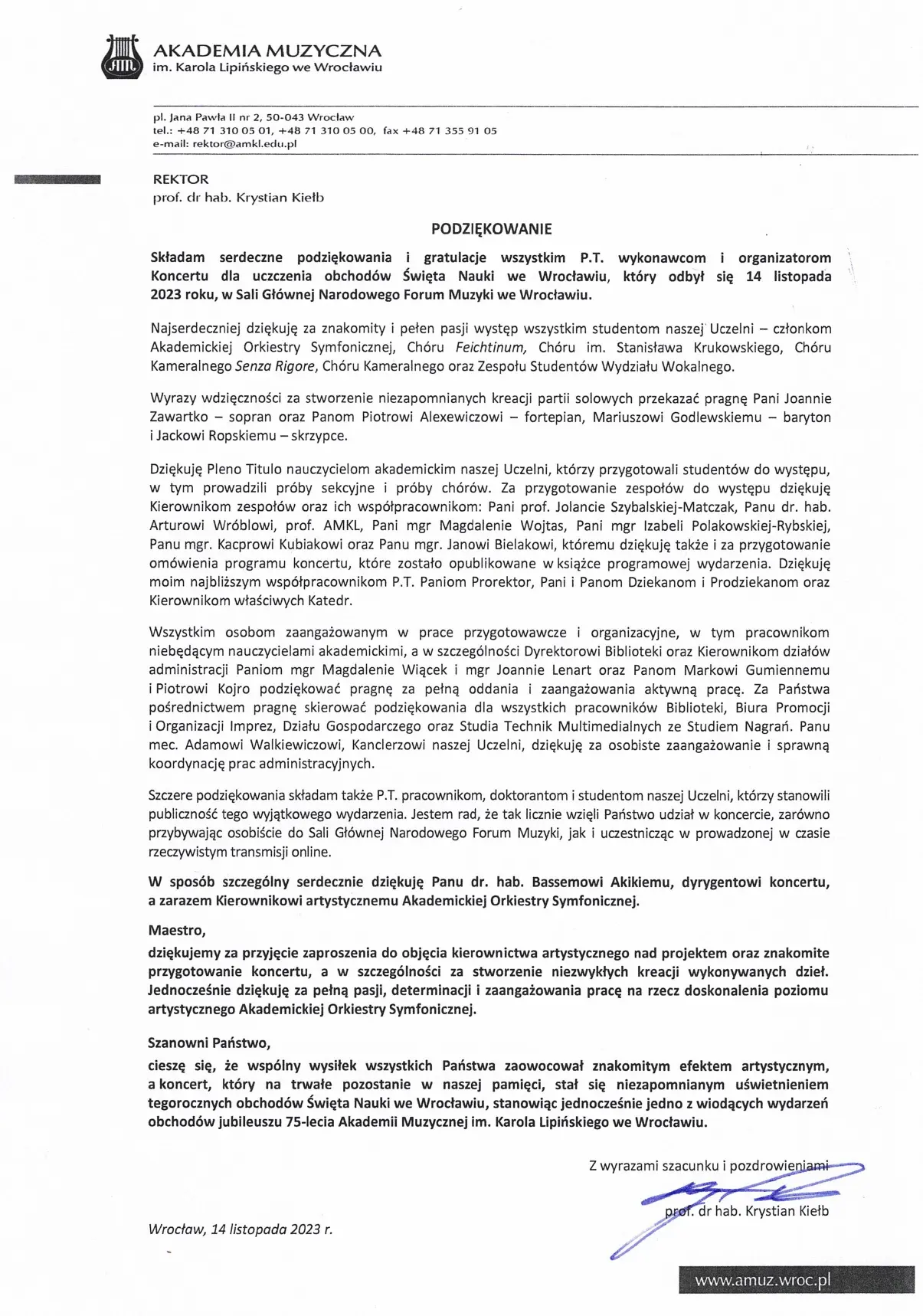 Podziękowania i gratulacje JM Rektora dla P.T. Wykonawców i Organizatorów Koncertu dla uczczenia obchodów Święta Nauki we Wrocławiu