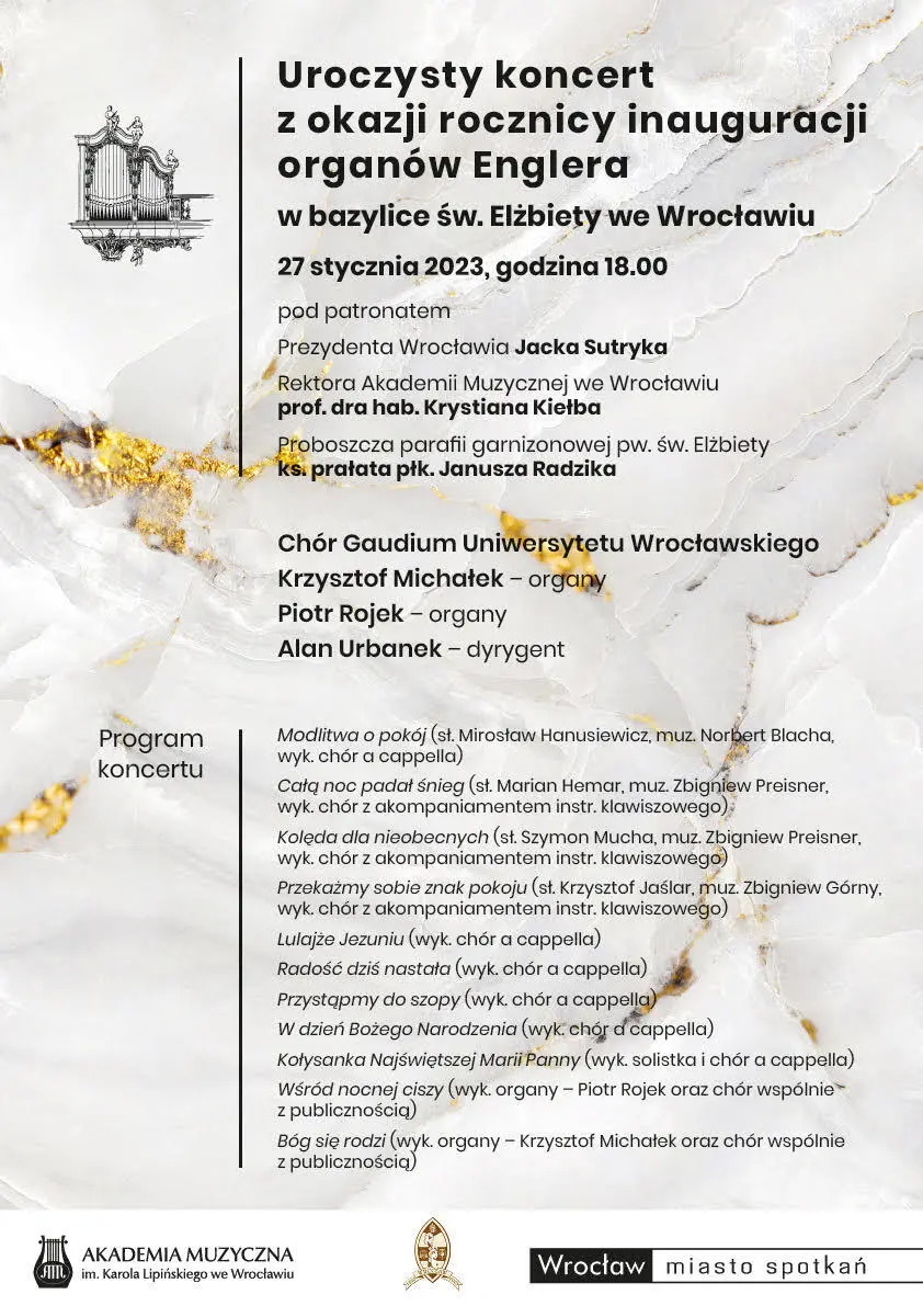 Uroczysty koncert z okazji rocznicy inauguracji organów Englera to kolejna możliwość posłuchania tego niezwykłego instrumentu. Dziś o godz 18.00 zapraszamy do bazyliki św. Elżbiety we Wrocławiu na wydarzenie, objęte patronatem Prezydenta Wrocławia Jacka Sutryka, Rektora AMKL prof. dra hab. Krystiana Kiełba oraz ks. prałata płk. Janusza Radzika.