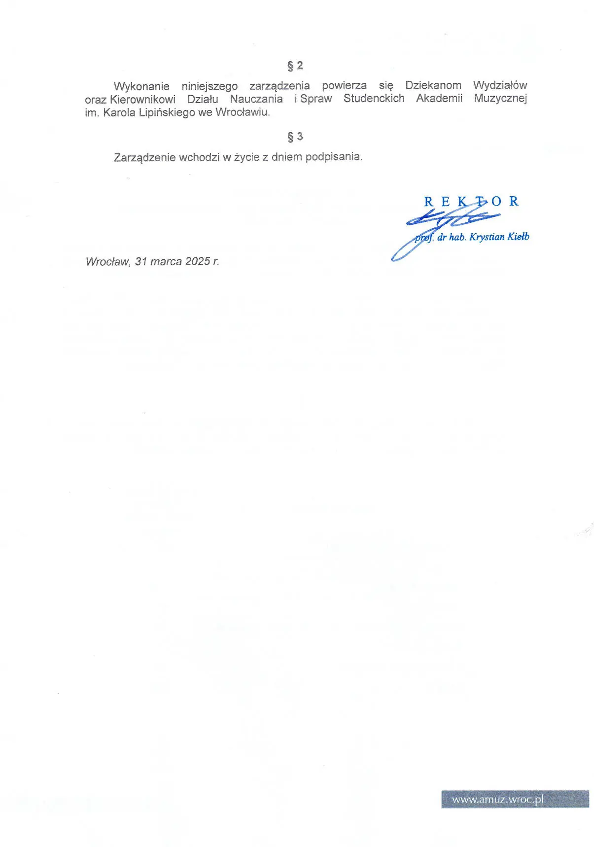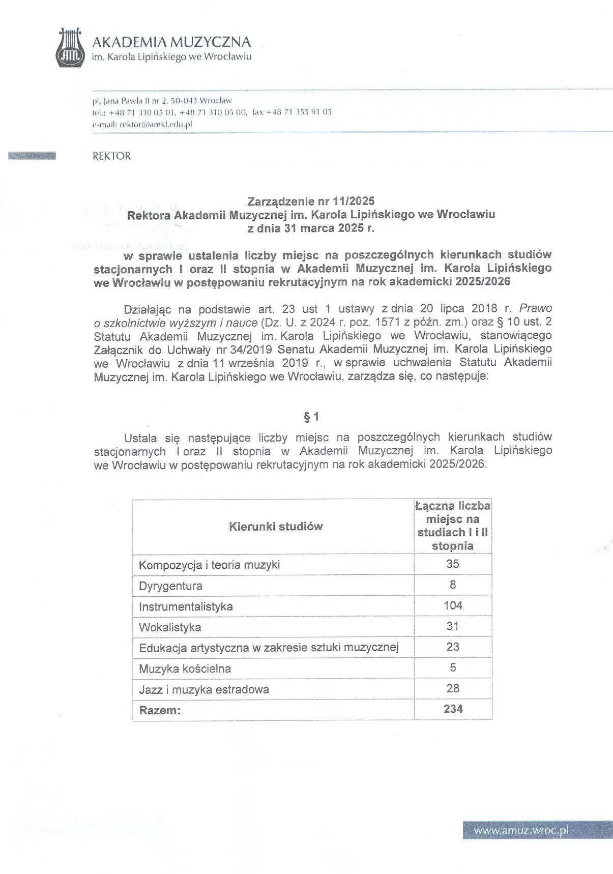 Prezentujemy zarządzenie JM Rektora Akademii Muzycznej im. Karola Lipińskiego we Wrocławiu prof. dra hab. Krystiana Kiełba w sprawie ustalenia liczby miejsc na poszczególnych kierunkach studiów w roku akademickim 2025/2026.