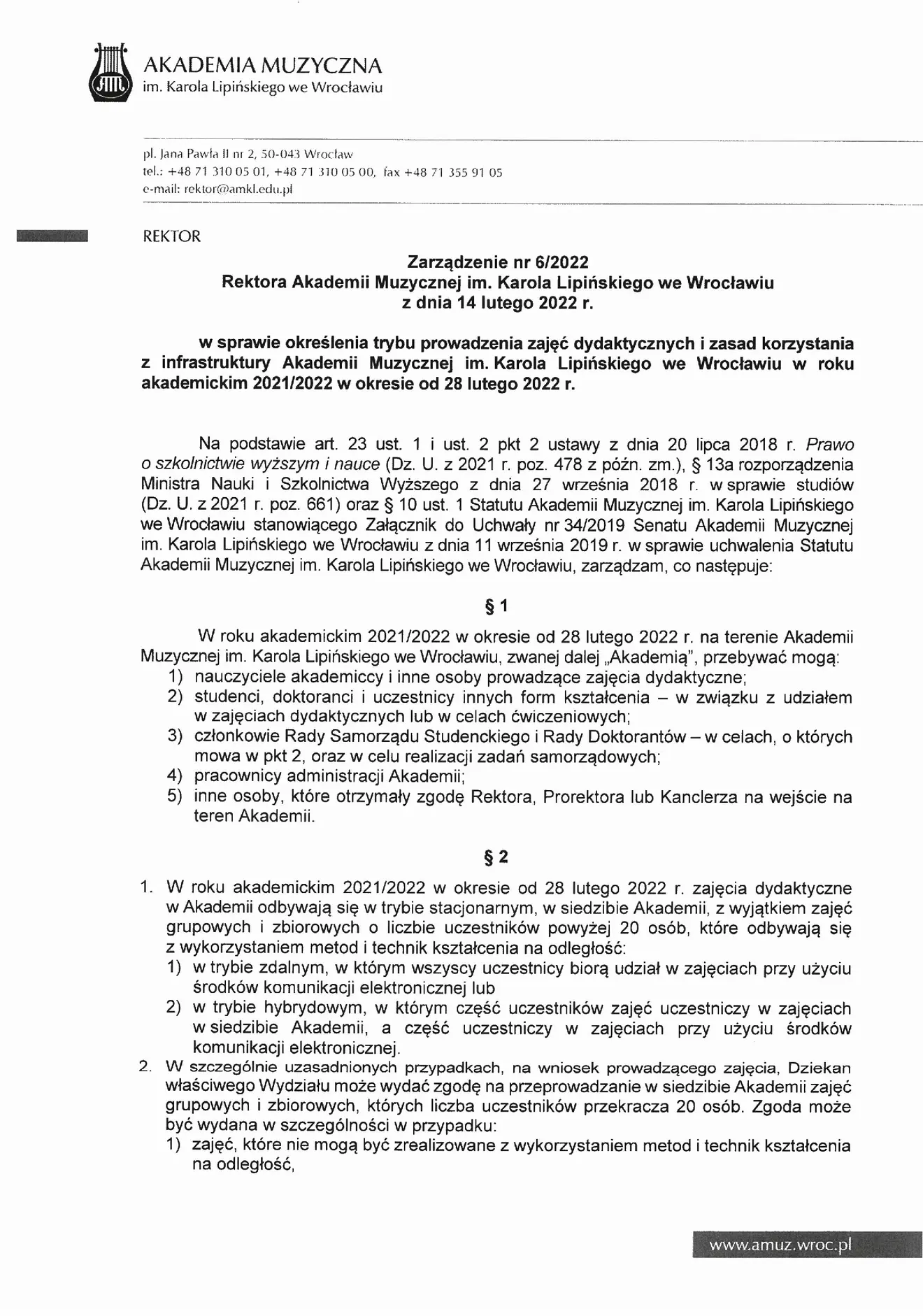 Zarządzenie nr 6-2022 Rektora AMKL z dnia 14 lutego 2022 r. w sprawie określenia trybu prowadzenia zajęć dydaktycznych od dnia 28.02.2022 r. v.3.pdf