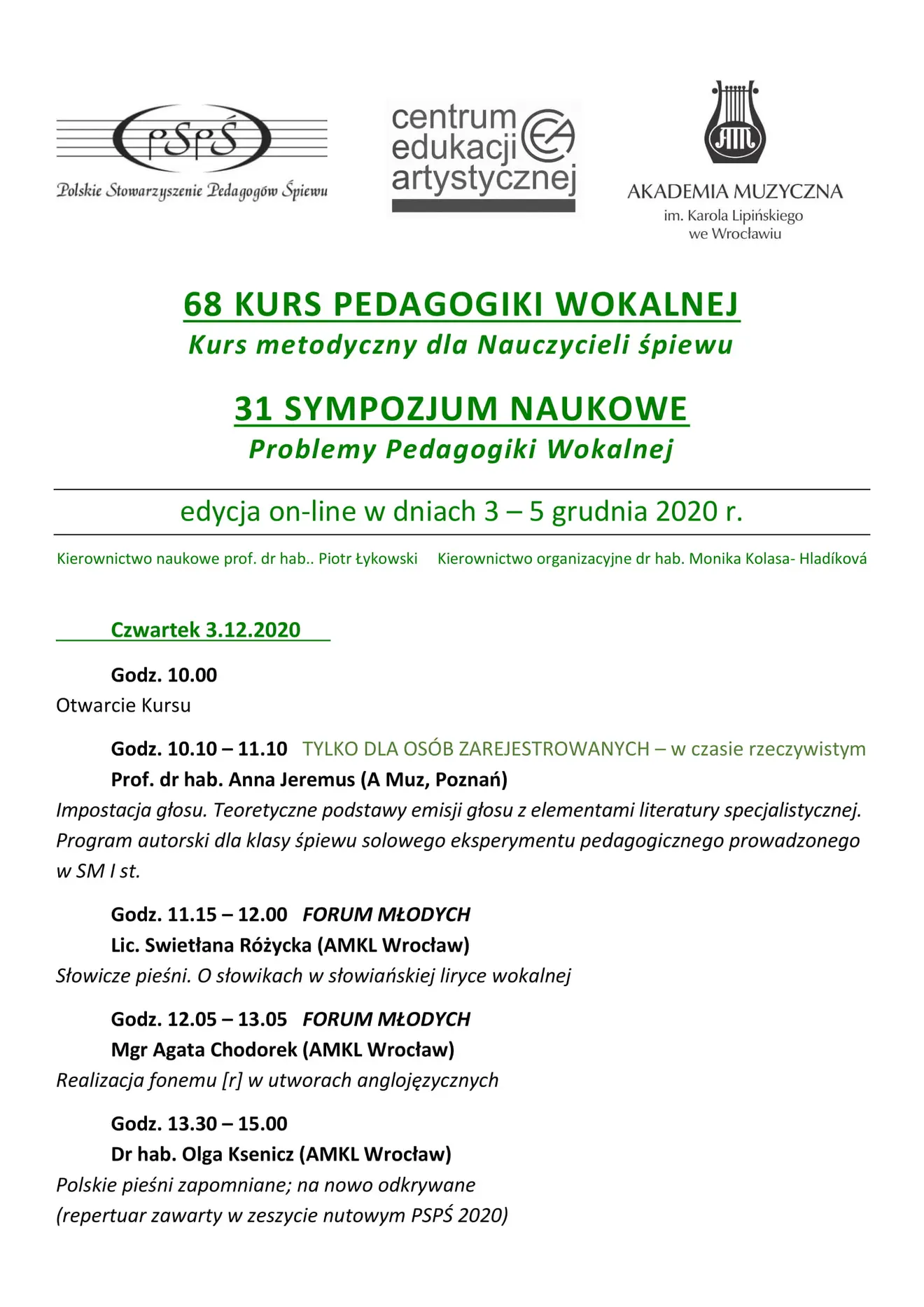 68. Kurs Pedagogiki Wokalnej oraz 31. Sympozjum Naukowe