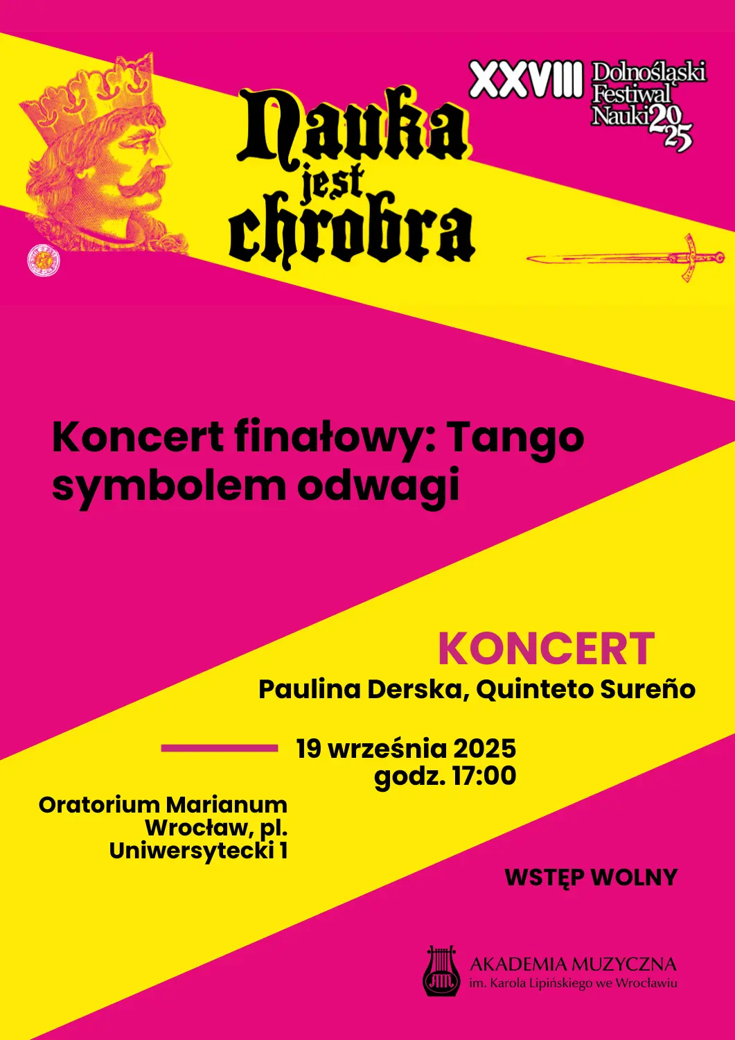 19.09.2025W dniu 19 września 2025 o godzinie 17:00 w Oratorium Marianum Uniwersytetu Wrocławskiego (Wrocław, pl. Uniwersytecki 1) odbędzie się Koncert finałowy - Tango symbolem odwagi. Zachęcamy do zapoznania się ze szczegółami wydarzenia dostępnymi na stronie Dolnośląskiego Festiwalu Nauki.