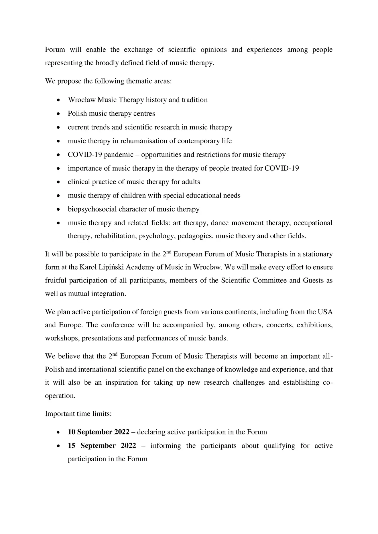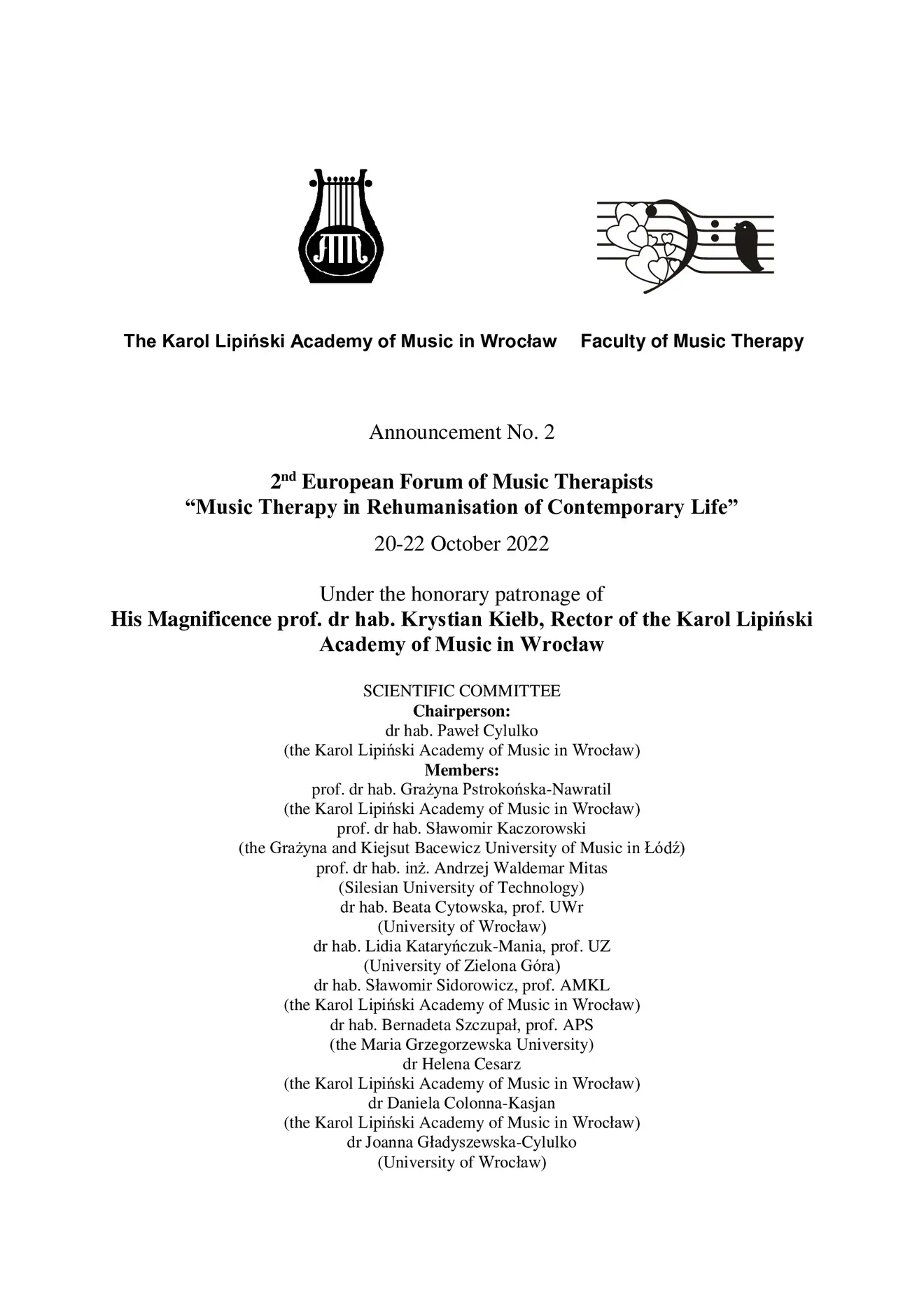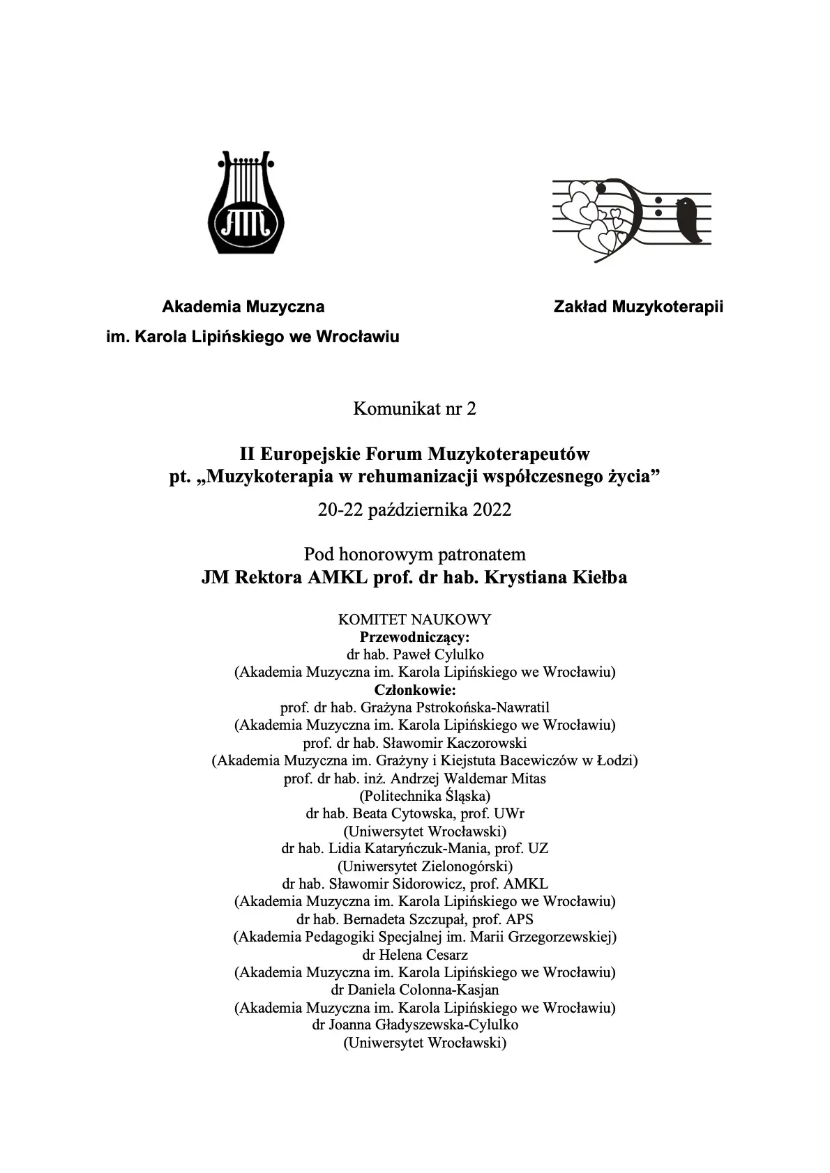 II Europejskie Forum Muzykoterapeutów "Muzykoterapia w rehumanizacji współczesnego życia"