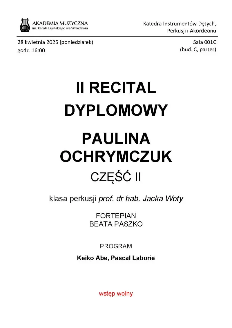 Recital wykonany zostanie przez Paulina Ochrymczuk z klasy perkusji prof. dr. hab. Jacka Wołty.