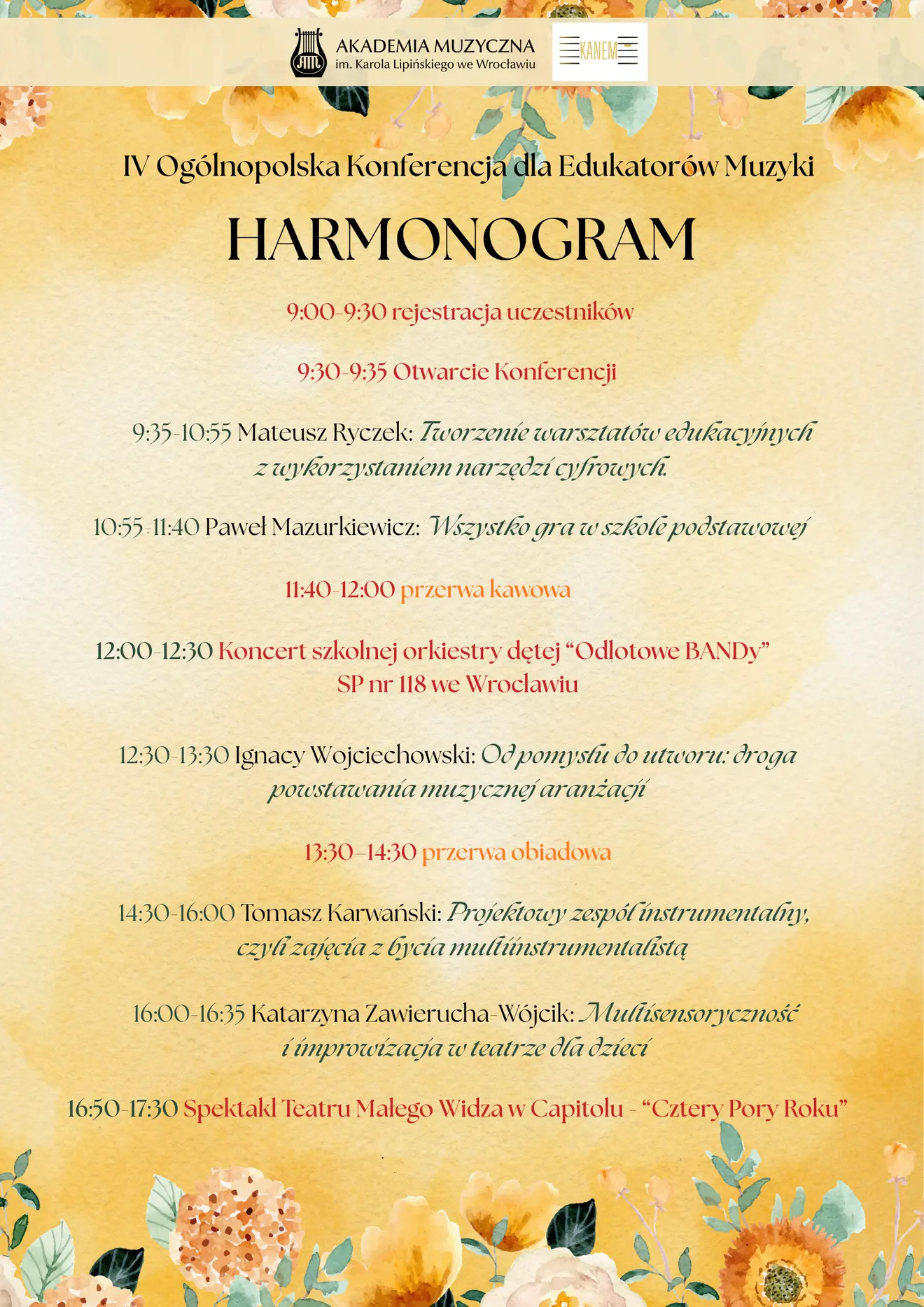 Udział płatnyW dniu 25 kwietnia 2026 w Akademii Muzycznej im. Karola Lipińskiego we Wrocławiu odbędzie się IV Ogólnopolska Konferencja dla Edukatorów Muzyki. Aby wziąć udział w wydarzeniu należy wypełnić formularz zgłoszeniowy: https://docs.google.com/forms/d/e/1FAIpQLSfUIfb4br-4nOUU11o8398tIX3i6IrRxRX1-RM6-8WFd5om2g/viewform oraz dokonać wpłaty do 17.04.2026. Zachęcamy do zapoznania się z Regulaminem.