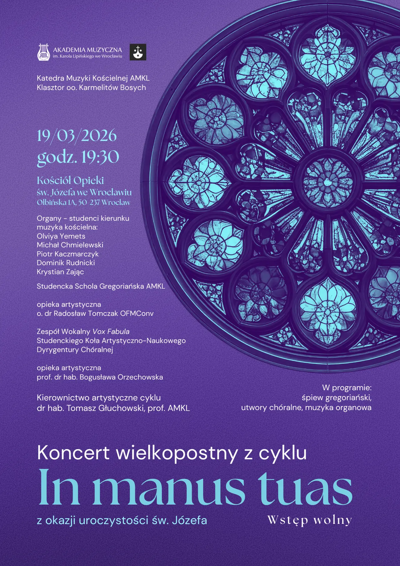 Wstęp wolnyZapraszamy na kolejny koncert wielkopostny z cyklu In manus tuas, który odbędzie się w Kościele Opieki św. Józefa we Wrocławiu.