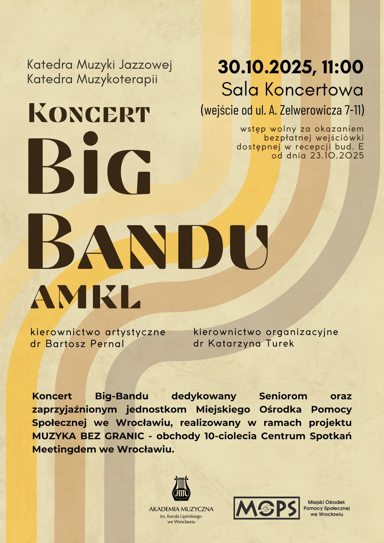 Bezpłatna wejściówkaZapraszamy na koncert Big-Bandu AMKL, dedykowany Seniorom oraz zaprzyjaźnionym jednostkom Miejskiego Ośrodka Pomocy Społecznej we Wrocławiu. Wydarzenie realizowane jest w ramach projektu MUZYKA BEZ GRANIC, z okazji 10-lecia Centrum Spotkań Meetingdem.