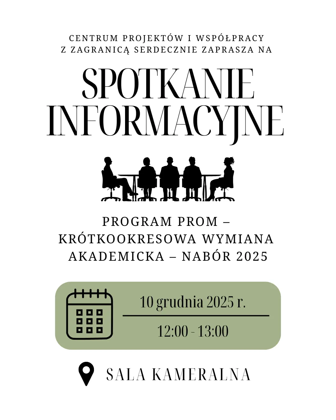 Wstęp wolnyCentrum Projektów i Współpracy z Zagranicą serdecznie zaprasza na spotkanie informacyjne dotyczące programu PROM – krótkookresowej wymiany akademickiej mającej na celu podniesienie kwalifikacji lub kompetencji uczestników Programu.