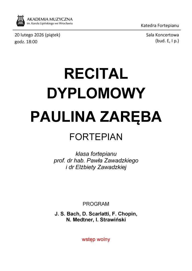 Wstęp wolnyZapraszamy do wysłuchania recitalu dyplomowego Pauliny Zaręby z klasy fortepianu prof. dr. hab. Pawła Zawadzkiego i dr Elżbiety Zawadzkiej.