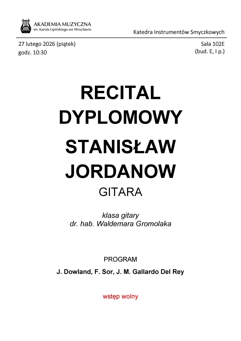 Wstęp wolnyZapraszamy do wysłuchania recitalu dyplomowego Stanisława Jordanowa z klasy gitary dra hab. Waldemara Gromolaka.