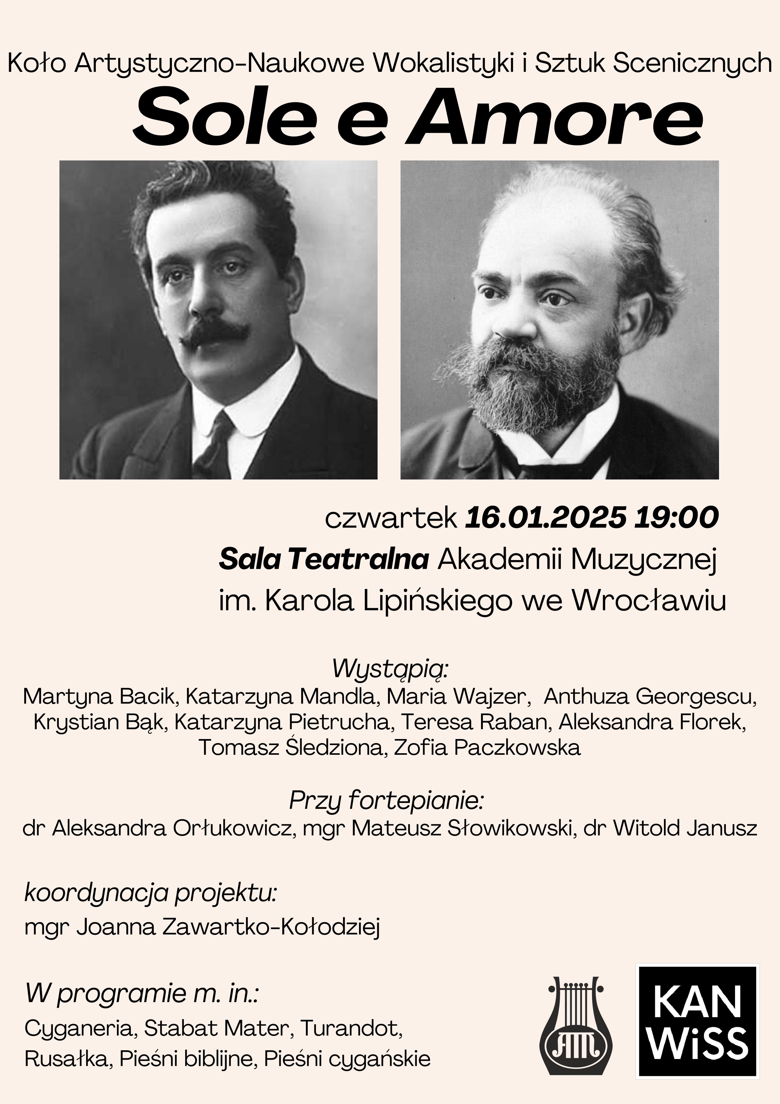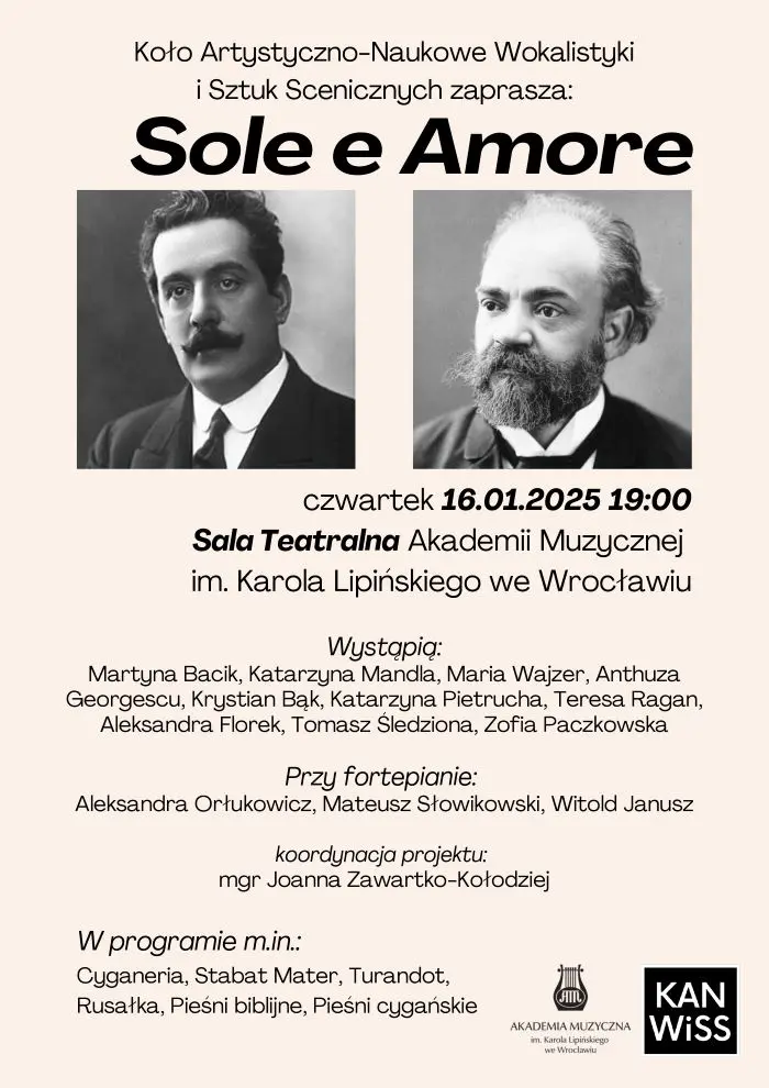 16.01.2025Koło Artystyczno-Naukowe Wokalistyki i Sztuk Scenicznych zaprasza na koncert „Sole e Amore”, który odbędzie się 16 stycznia 2025 roku o godzinie 19:00 w Sali Teatralnej Akademii Muzycznej im. Karola Lipińskiego we Wrocławiu.