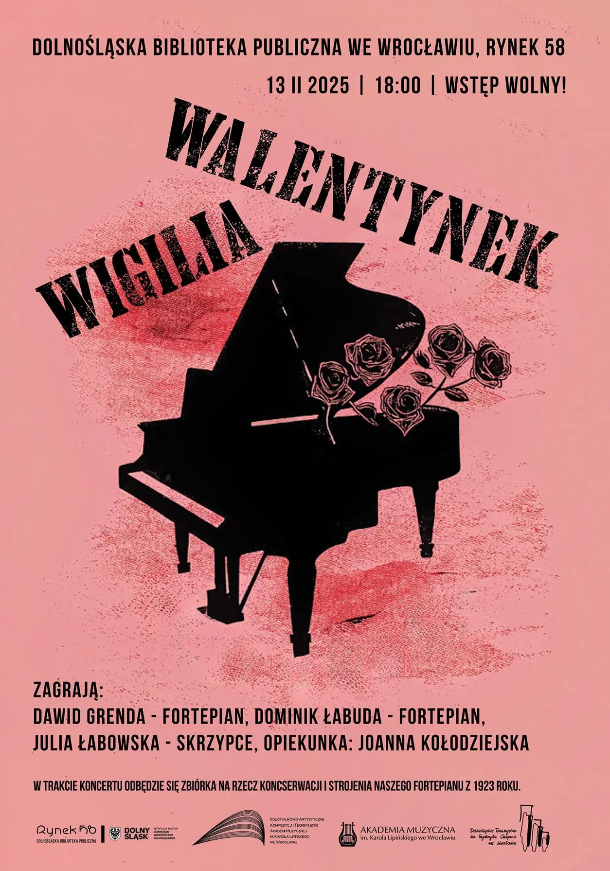 13.02.2025Koncert „Wigilia Walentynek” odbywa się 13 lutego 2025 roku o godzinie 18:00 w Dolnośląskiej Bibliotece Publicznej we Wrocławiu.