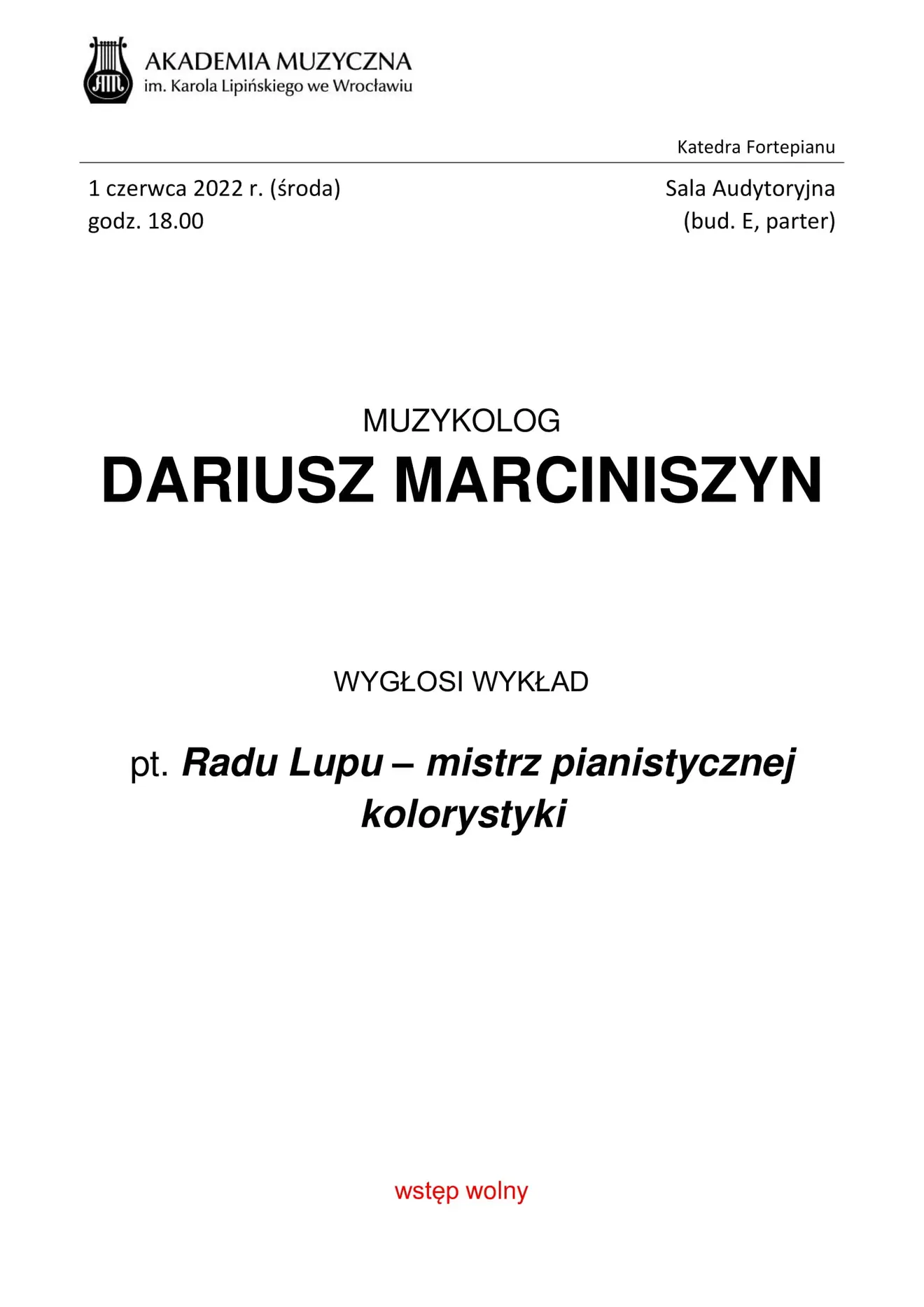 Wykład "Radu Lupu – mistrz pianistycznej kolorystyki" – Dariusz Marciniszyn