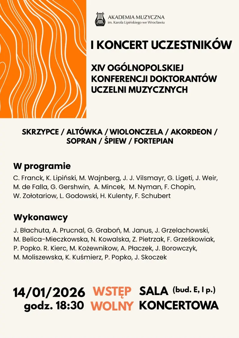 Wstęp wolnyAkademia Muzyczna im. K. Lipińskiego we Wrocławiu i Szkoła Doktorska AMKL uprzejmie zapraszają na XIV Ogólnopolską Konferencja Doktorantów Uczelni Muzycznych. Odbędzie się ona w dniach 14-15 stycznia 2026 roku we Wrocławiu w siedzibie Akademii Muzycznej im. Karola Lipińskiego.