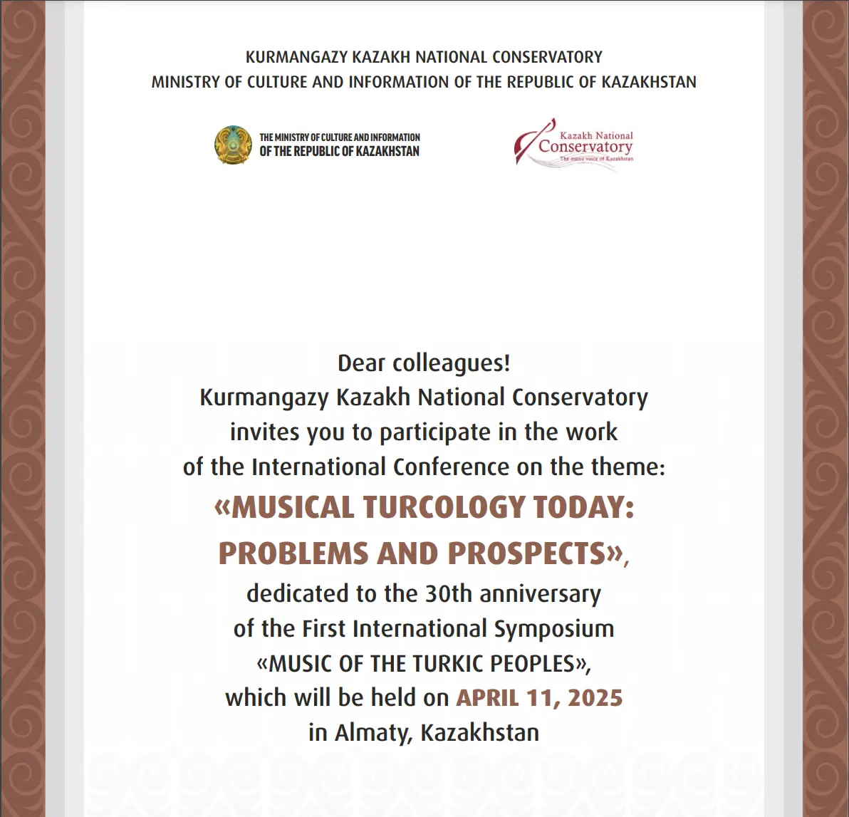 Kazachskie Konserwatorium Narodowe Kurmangazy zaprasza do udziału w Międzynarodowej Konferencji "Musical Turcology Today: Problems and Prospects", poświęconej 30. rocznicy I Międzynarodowego Sympozjum „Muzyka Narodów Turków”, które odbędzie się 11 kwietnia 2025 r. (Ałmaty, Kazachstan).
