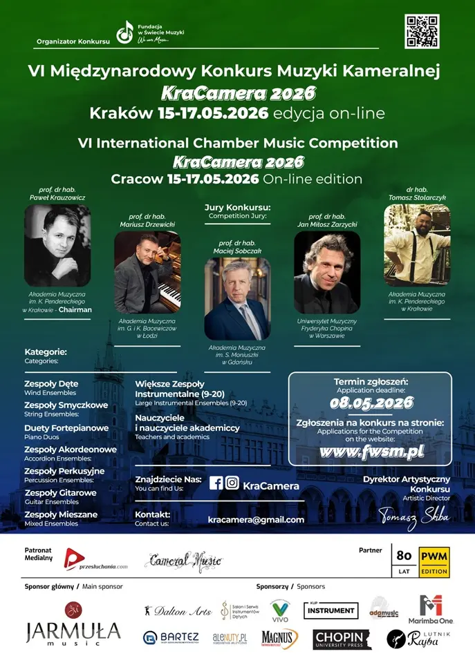 W dniach 15-17.05.2026 r. w formule on-line odbędzie się VI Międzynarodowy Konkurs Muzyki Kameralnej KraCamera 2026.