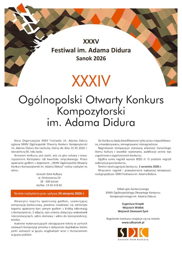 Biuro Organizacyjne XXXV Festiwalu im. Adama Didura ogłasza XXXIV Ogólnopolski Otwarty Konkurs Kompozytorski im. Adama Didura dla twórców, którzy do dnia 31 XII 2026 r. nie ukończą 30. roku życia.