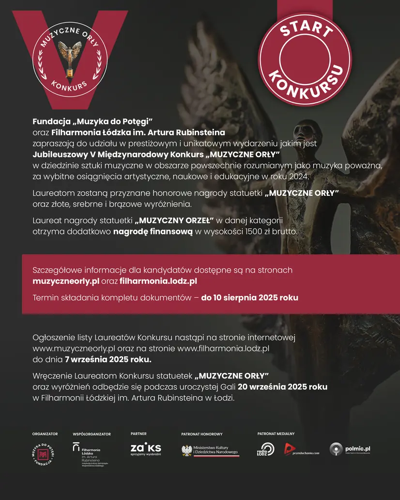 Fundacja “Muzyka do Potęgi”, Filharmonia Łódzka im. Artura Rubinsteina oraz Stowarzyszenie Autorów ZAiKS mają zaszczyt zaprosić do udziału w prestiżowym i unikatowym wydarzeniu jakim jest Jubileuszowy V Międzynarodowy Konkurs „MUZYCZNE ORŁY” w dziedzinie sztuki muzyczne w obszarze powszechnie rozumianym jako muzyka poważna za wybitne osiągnięcia artystyczne, naukowe i edukacyjne w roku 2024.