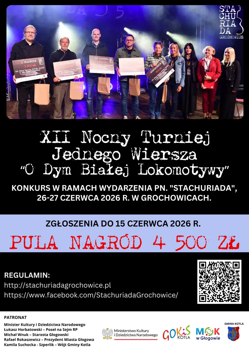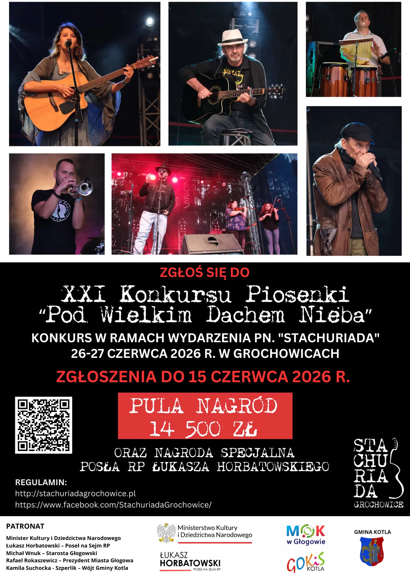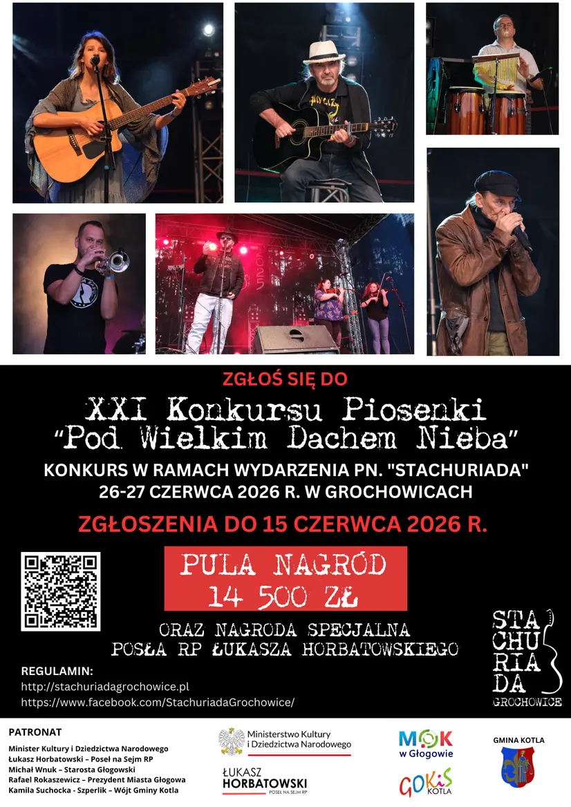 Gminny Ośrodek Kultury i Sportu w Kotli serdecznie zaprasza do udziału w dwóch wyjątkowych konkursach artystycznych: XXI Konkursie Piosenki „Pod Wielkim Dachem Nieba” oraz XIII Nocnym Turnieju Jednego Wiersza „O Dym Białej Lokomotywy”, które odbywają się w ramach 32. Ogólnopolskiego Festiwalu Piosenki Stachuriada na grochowickiej polanie, w gminie Kotla (powiat głogowski, województwo dolnośląskie), w dniach 26–27 czerwca 2026 r.