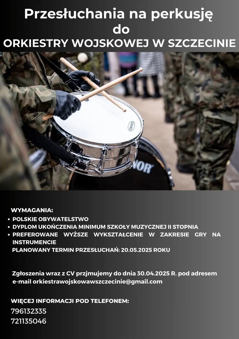 Zgłoszenia wraz z CV przyjmowane są do dnia 30.04.2025 r. pod adresem e-mail: orkiestrawojskowawszczecinie@gmail.com