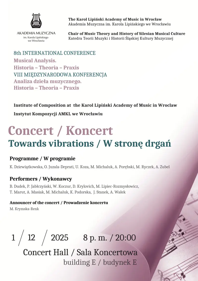 W dniu 1 grudnia 2025 w Akademii Muzycznej im. Karola Lipińskiego we Wrocławiu odbył się Koncert Towards vibrations / W stronę drgań, który był częścią VIII Międzynarodowej Konferencji Naukowej „Analiza dzieła muzycznego. Historia-Theoria-Praxis”.